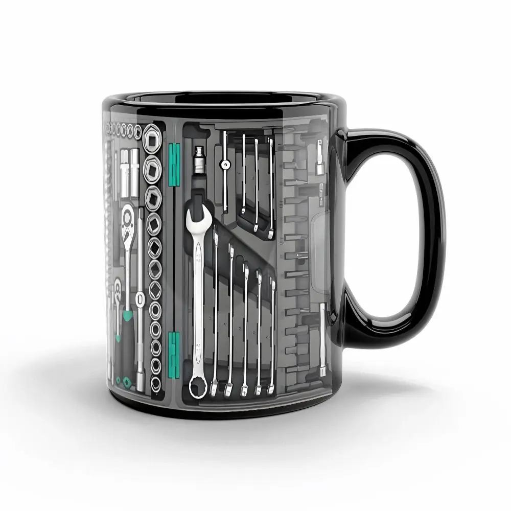 Divertida taza de café de 325 ml con diseño de caja de herramientas y llave inglesa, taza de cerámica resistente para mecánico, regalo para mecánico de automóviles.